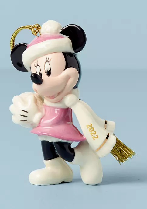 Minnie is ready for some whimsical, winter fun! She’s bundled up in a rosy pink outfit and adorable hat. Her glossy white scarf is decorated with an iconic and golden 2022.