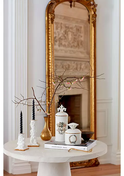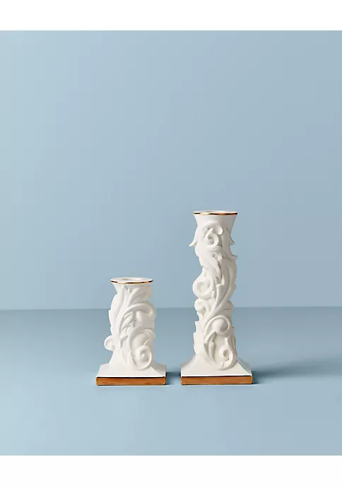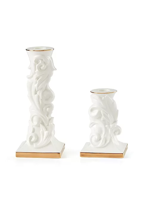Luxe in glossy white porcelain, this 2-piece candlestick set is a designed as a modern retelling of our past that also serves an elegant refresh to your home. Rich in sumptuous curves, ornate carvings and golden accents, these filigree candlesticks make gorgeous statement pieces for your mantel.