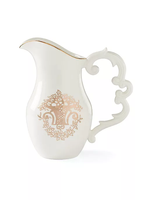 Luxe in glossy white porcelain, this tall pitcher is an inspired revival of our 1918 Autumn collection with its shimmering update of the iconic cornucopia pattern. It’s designed as a modern retelling of our past that also serves an elegant refresh to your home. Rich in sumptuous curves, ornate handlework and a golden trim at the opening, this pitcher makes a gorgeous statement piece for your mantel.