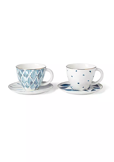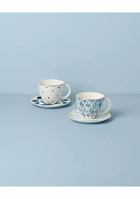 New to our popular Blue Bay collection is this 4-piece teacup and saucer set] Both the teacups and saucers feature organic textures that are slightly bumpy to the touch for a unique design unlike any other. We added a thin gold band to the top and around the saucers for a little touch of luxe that is completely microwave safe]