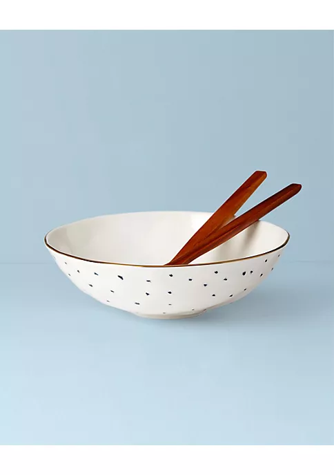 New to our popular Blue Bay collection is this salad bowl set that comes with its own wood serving pieces. The bowl features an organic texture that is slightly bumpy to the touch for a unique design unlike any other. We added a thin gold band to the top for a little touch of luxe when you’re enjoying your favorite greens.