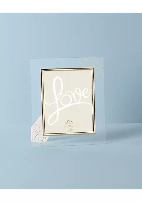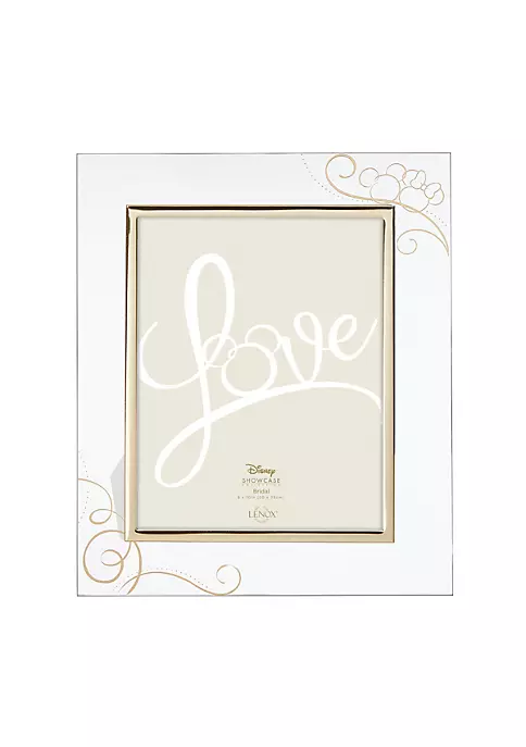 Celebrate the magic of love with this precious Disney frame that has Mickey and Minnie swirled into the design. Crafted of glass and finished with a 24k gold decal, this frame is perfect for the couple who just celebrated a wedding, engagement or anniversary.