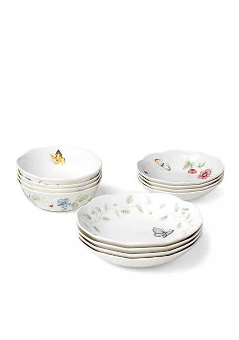 Artist Louise Le Luyer sets butterflies free on this Butterfly Meadow 12-Piece Bowl Set. Featuring soft scalloped edges and floral accents, this unique dinnerware brings a graceful look to any dinner table.
