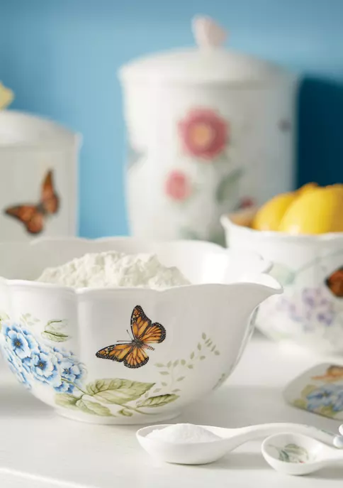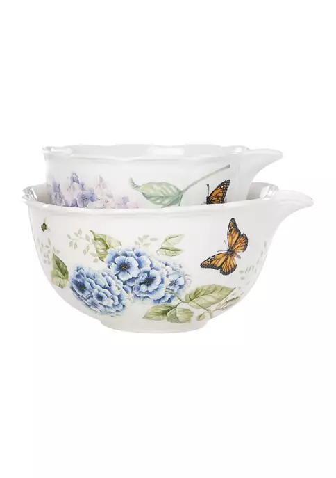 Crafted of durable white ceramic porcelain, the Butterfly Meadow 2-Piece Nesting Bowl Set from Lenox® features a bright and vibrant motif of butterflies and blossoming flowers. Ideal for mixing and preparing a meal, this set is microwave and dishwasher-safe, for added convenience.