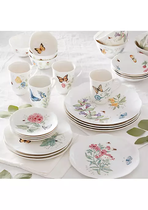 Lively butterflies, dragonflies, and bumblebees buzz about a variety of vibrant flowers on this 28-piece Butterfly Meadow dinnerware set. The trademark design features elegant scalloped edges on durable white porcelain. The bonus? Everything is both microwave and dishwasher safe. Pick up our best-selling set from our #1 Butterfly Meadow collection today]