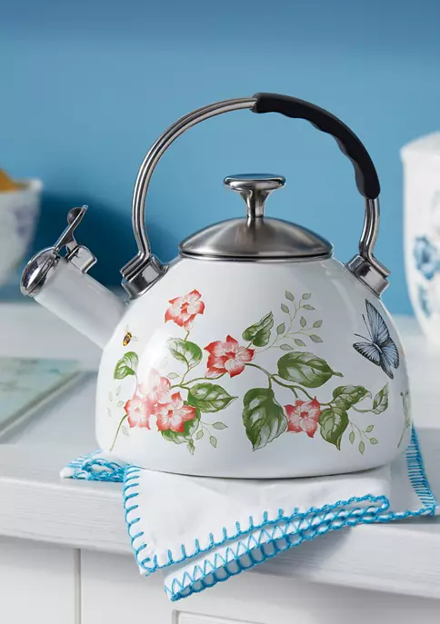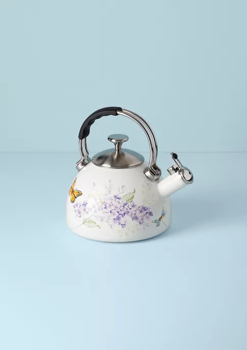 The Butterfly Meadow Tea Kettle showcases a lively scene of butterflies across its enamelware surface. The stainless steel handle features a thick grip to maintain a comfortable temperature and easy handling.