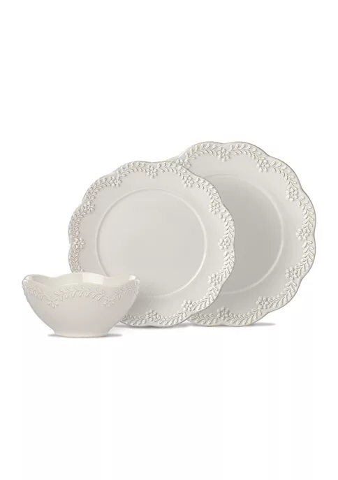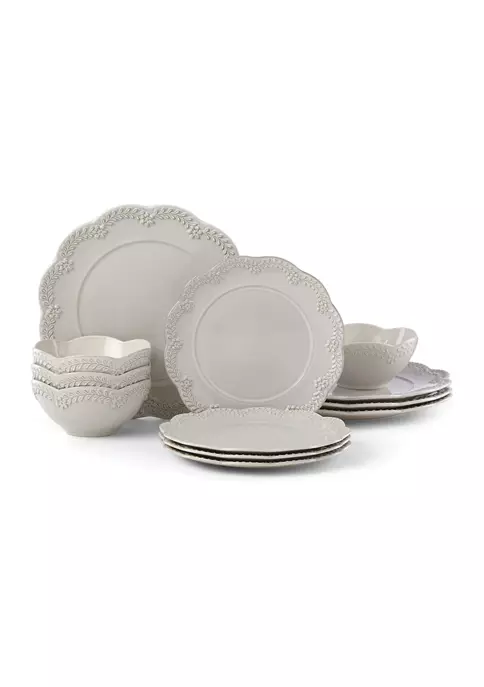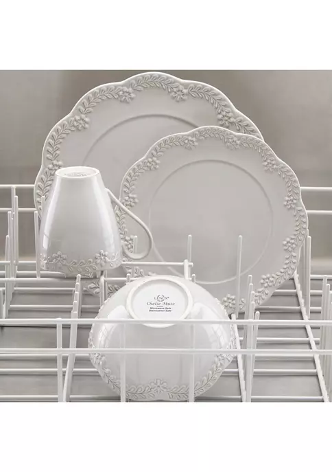 An elegant wreath of opposite-leafed branches and flowers follow scalloped edges with a reactive glaze. From the Chelse Muse Floral Gray Collection, this 12-piece set by Lenox® is crafted in gray ironstone is dishwasher and microwave-safe.