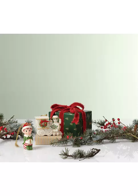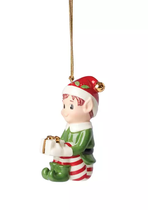 Find this happy holiday elf ornament hiding in the branches of your tree. He’ll fit right in with all your classically cute Christmas decorations and find the perfect place to sit, he even has an extra present perched on his candy cane patterned lap.