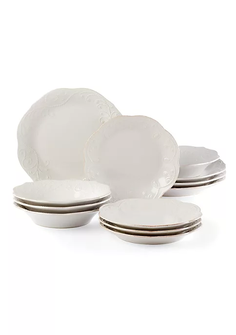 The French Perle collection is crafted of durable white ceramic stoneware with a gentle scalloped design and a textured dot pattern. This elegant 12-piece set includes four dishwasher and microwave-safe dinner plates, accent plates and pasta bowls.