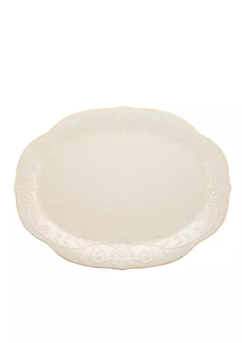 This quaint oval serving platter, crafted of durable ceramic stoneware in a crisp white, includes a textured pattern of scrolling, swirling beads along its gossamer hand-applied tea-stained border. This item is microwave and dishwasher-safe, for added convenience.