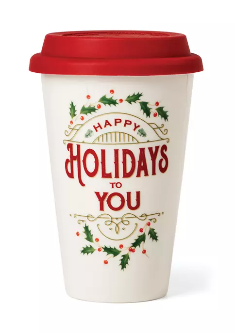 Carry a sip of the holidays on the go with this festive travel mug. Featuring holly leaf motifs crafted with seasonal spirit on a snowy white base.