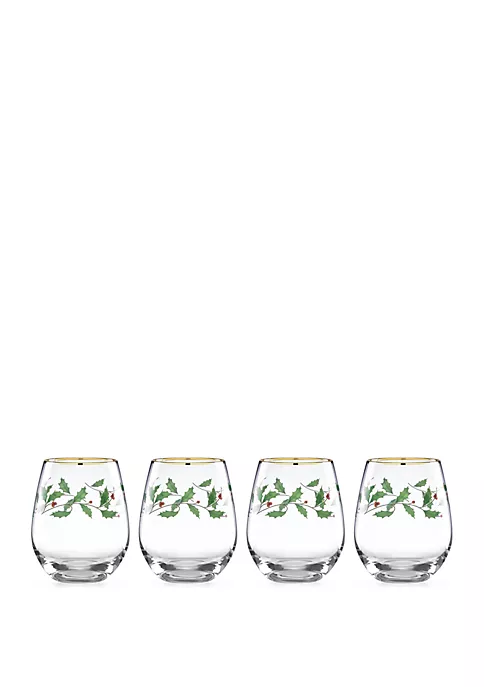 Ideal for enjoying a full-bodied cabernet sauvignon or perhaps a robust merlot, the Holiday Gold Set of 4 Wine Glasses Lenox® features a festive holly motif of hand-etched details. A celebration of the winter aesthetic, this set is rimmed in regal gold accenting.