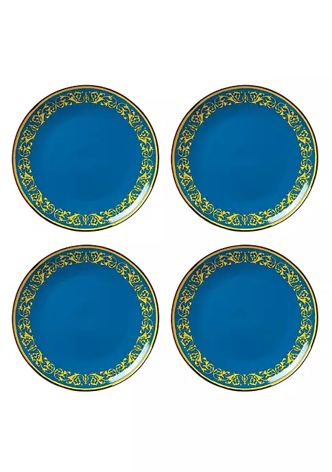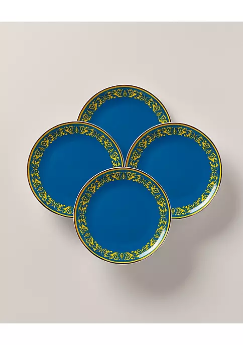 We’re beyond excited to unveil LX Remix: a classic-meets-contemporary collection that’s vintage Lenox with a twist. We’re bringing back our past in vibrant fashion with bold colors mixed with our legendary patterns. These blue accent plates feature a flourishing yellow border in our iconic Westchester vase motif from 1915. Westchester is one of our most distinguished collections that even caught the eye of First Lady Edith Wilson. She loved it so much that she commissioned Lenox to create dinnerware for the White House back in 1918. This four-piece set honors that legacy and gives it a modern update with its durable porcelain craftsmanship that’s dishwasher safe and perfect for everyday use. We added a gold trim around the artwork to give it that beautiful, luxe finish you love. Think of LX Remix as a bridge between vintage Lenox and modern day…with just a century or so in between]